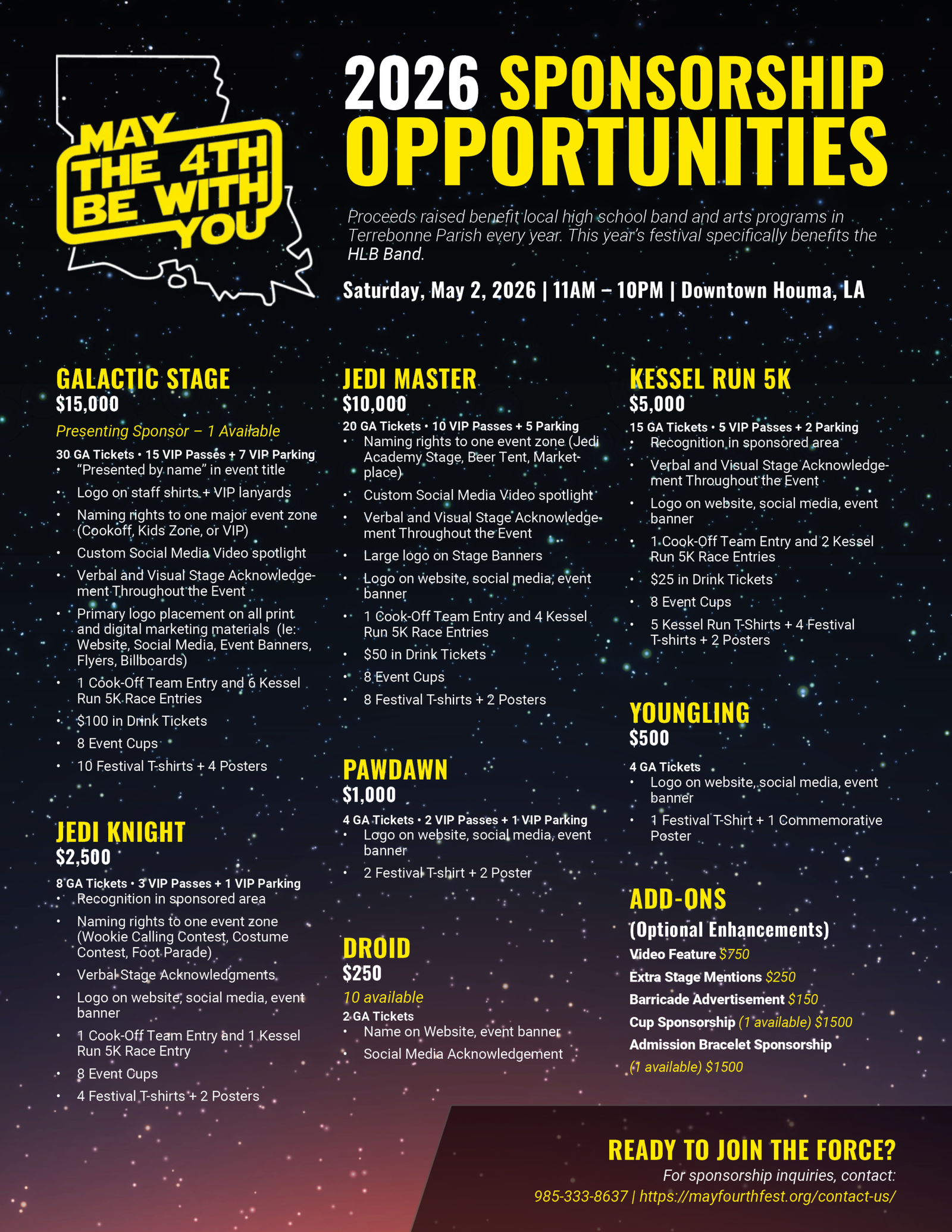 Sponsoring the May the Fourth Be With You Festival gives your business incredible visibility while supporting a great cause. Your sponsorship helps fund the H.L. Bourgeois High School Band and ensures the success of this beloved community event.